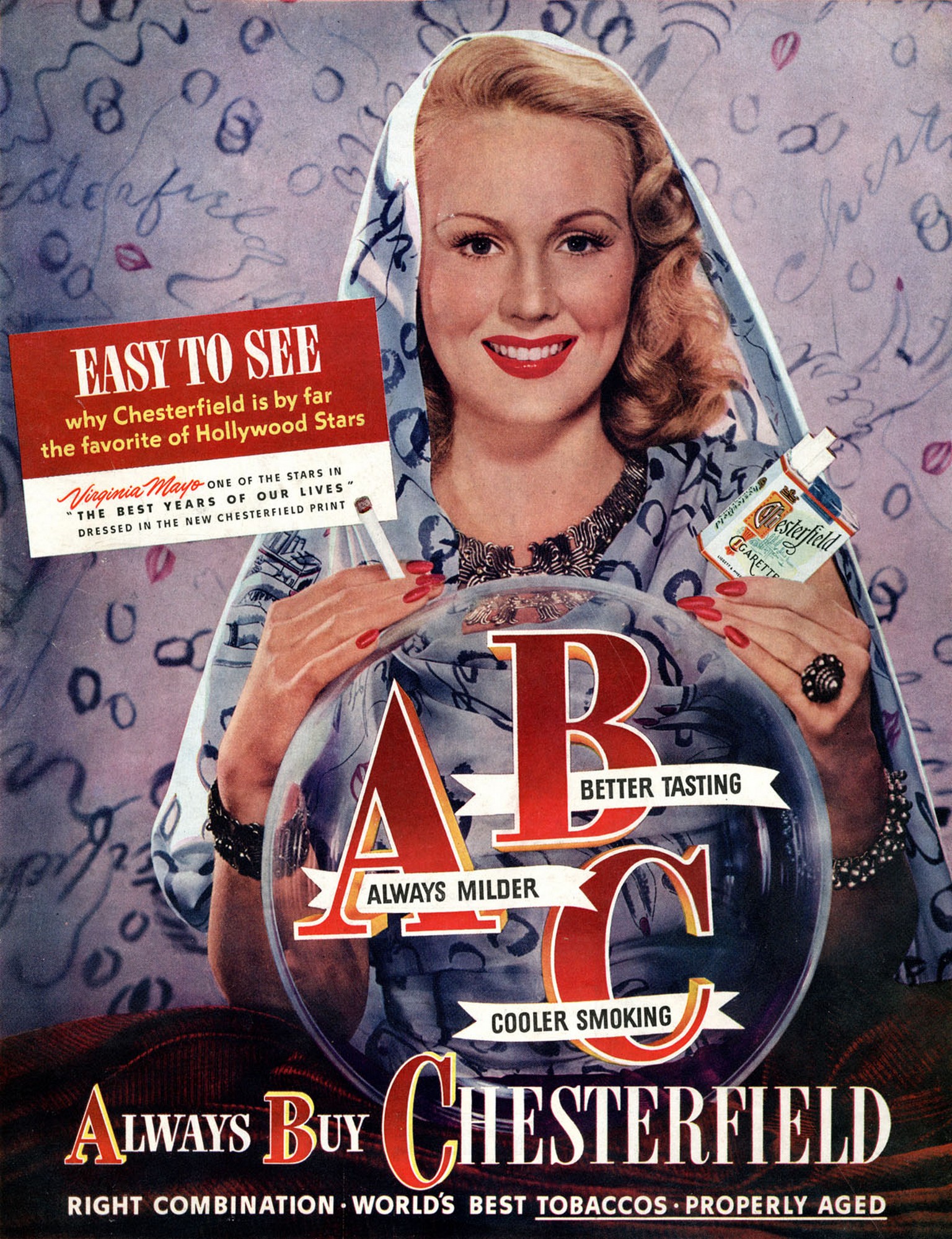 Main » Smoking » Chesterfield Ad and Poster Collection » 1947 Easy To See why Chesterfield is by far the favorite of Hollywood Stars. Virginia Mayo
