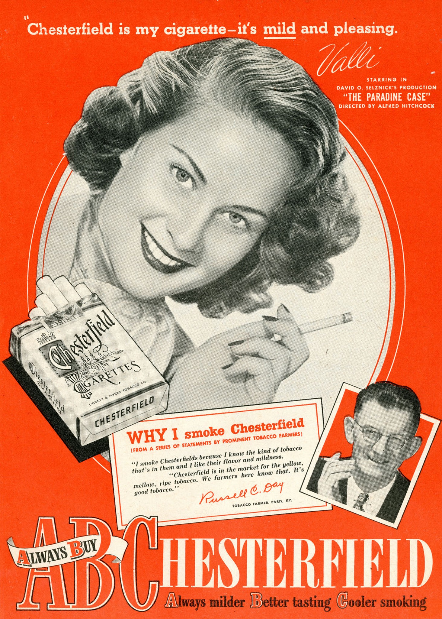1948 ‘Chesterfield is my cigarette – it’s mild and pleasing.’ Valli Source: Stanford School of Medicine