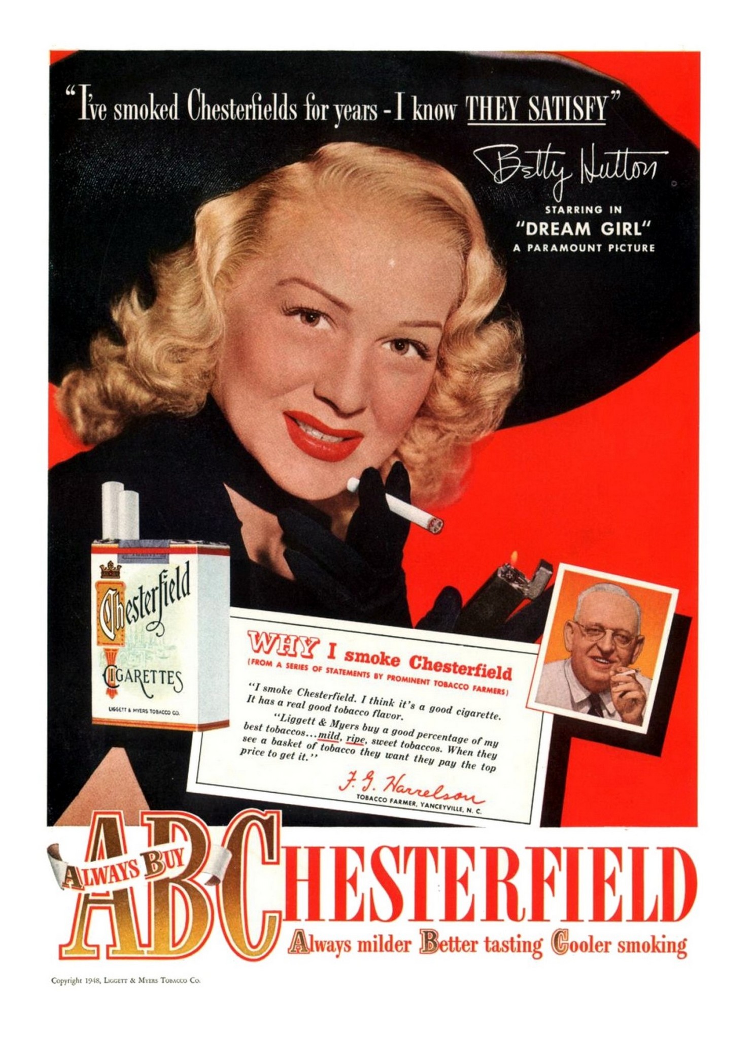 Main » Smoking » Chesterfield Ad and Poster Collection » 1948 ‘I’ve smoked Chesterfield for years – I know They Satisfy’ Betty Hutton