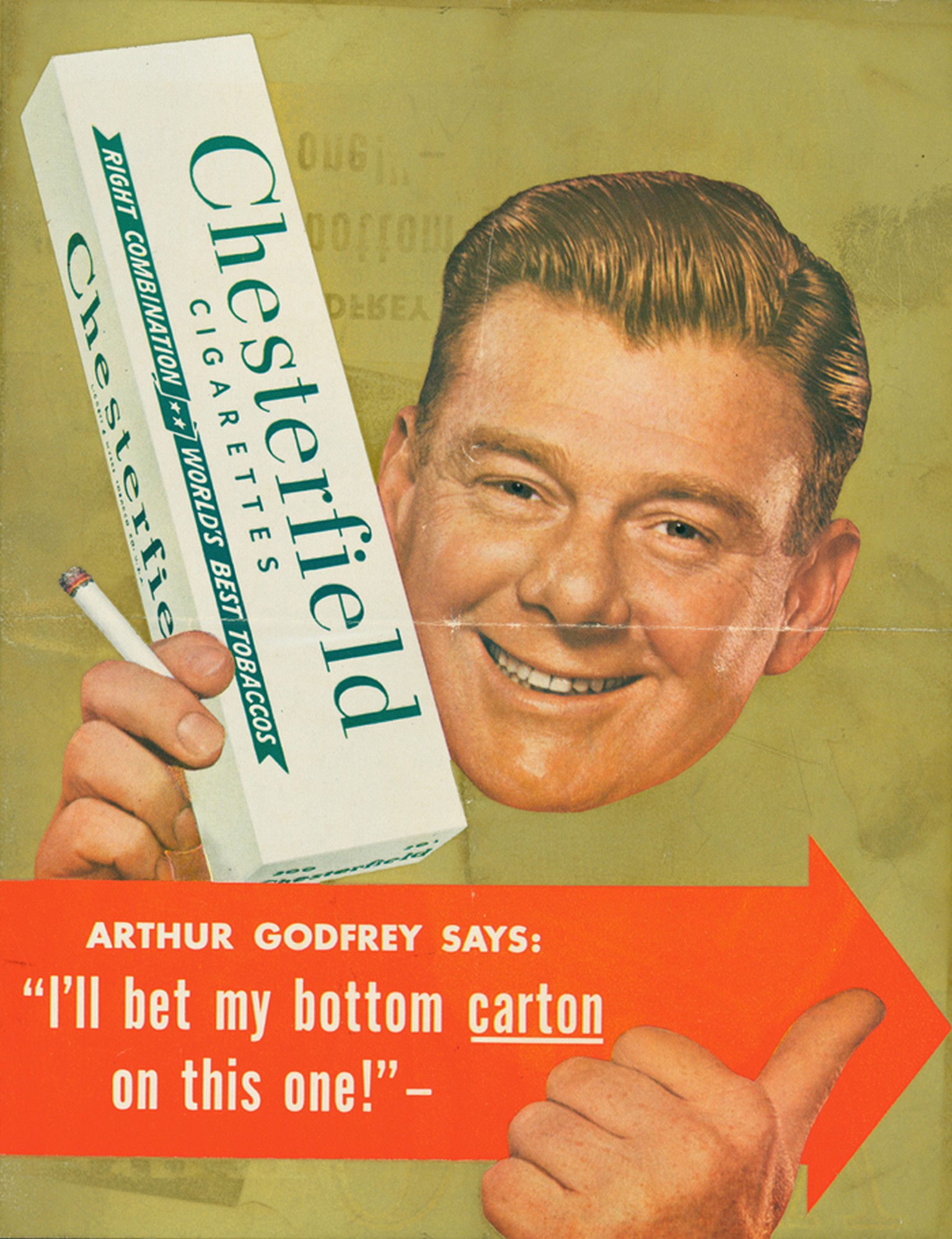 Main » Smoking » Chesterfield Ad and Poster Collection » 1949 Chesterfield. Arthur Godfrey Says ‘I’ll bet my bottom carton on this one!’