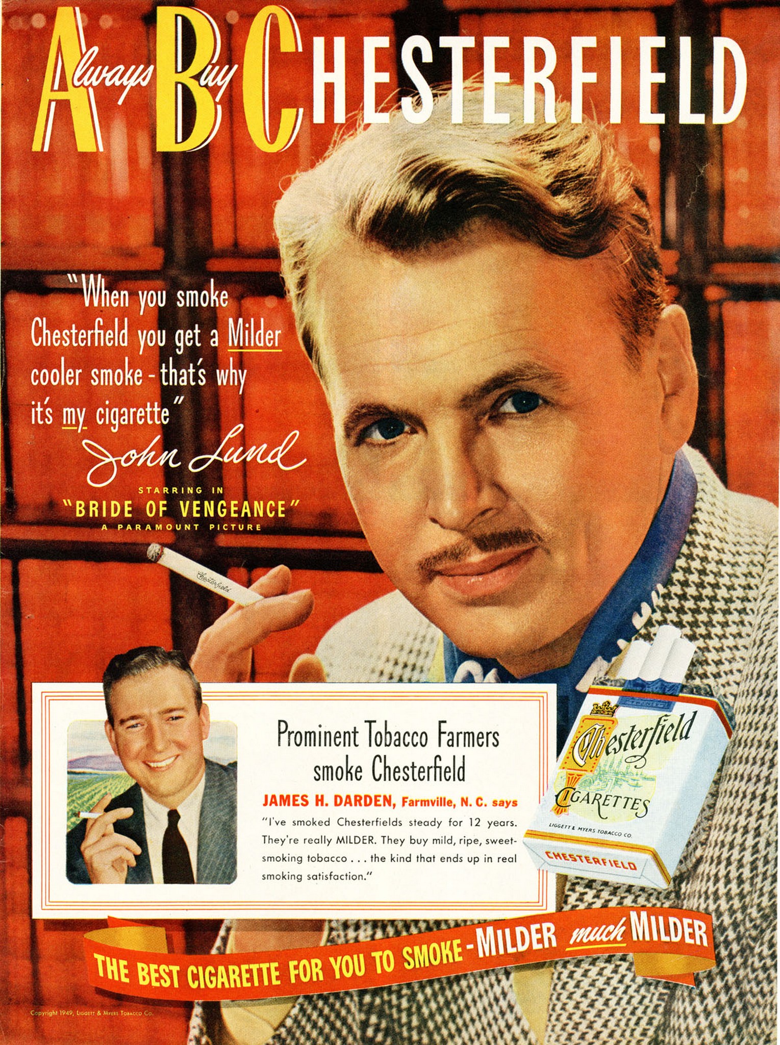1949 ‘When you smoke Chesterfield you get a Milder cooler smoke – That’s why it’s my cigarette’ John Lund