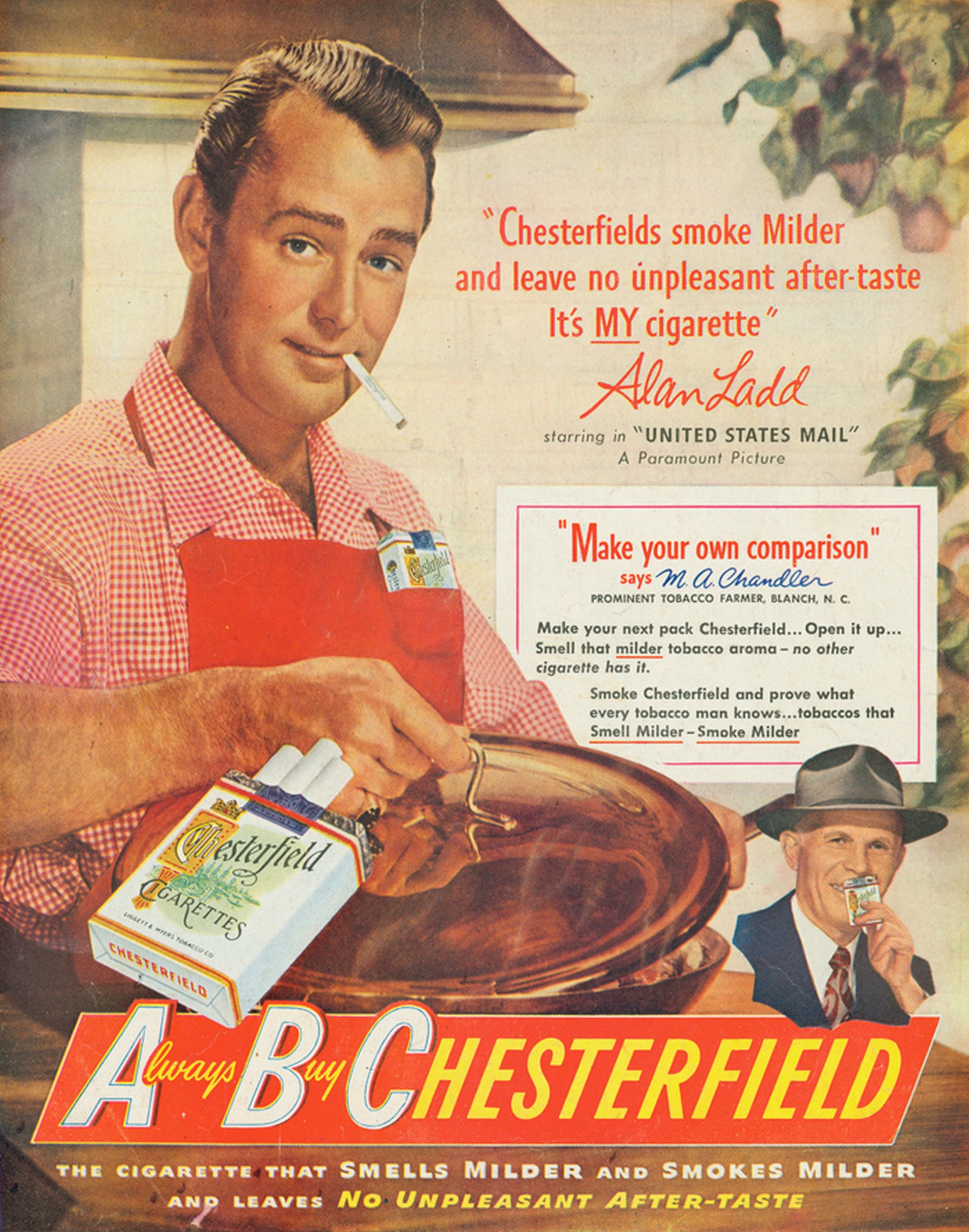 1950 ‘Chesterfields smoke Milder and leave no unpleasant after-taste It’s My Cigarette’ Alan Ladd