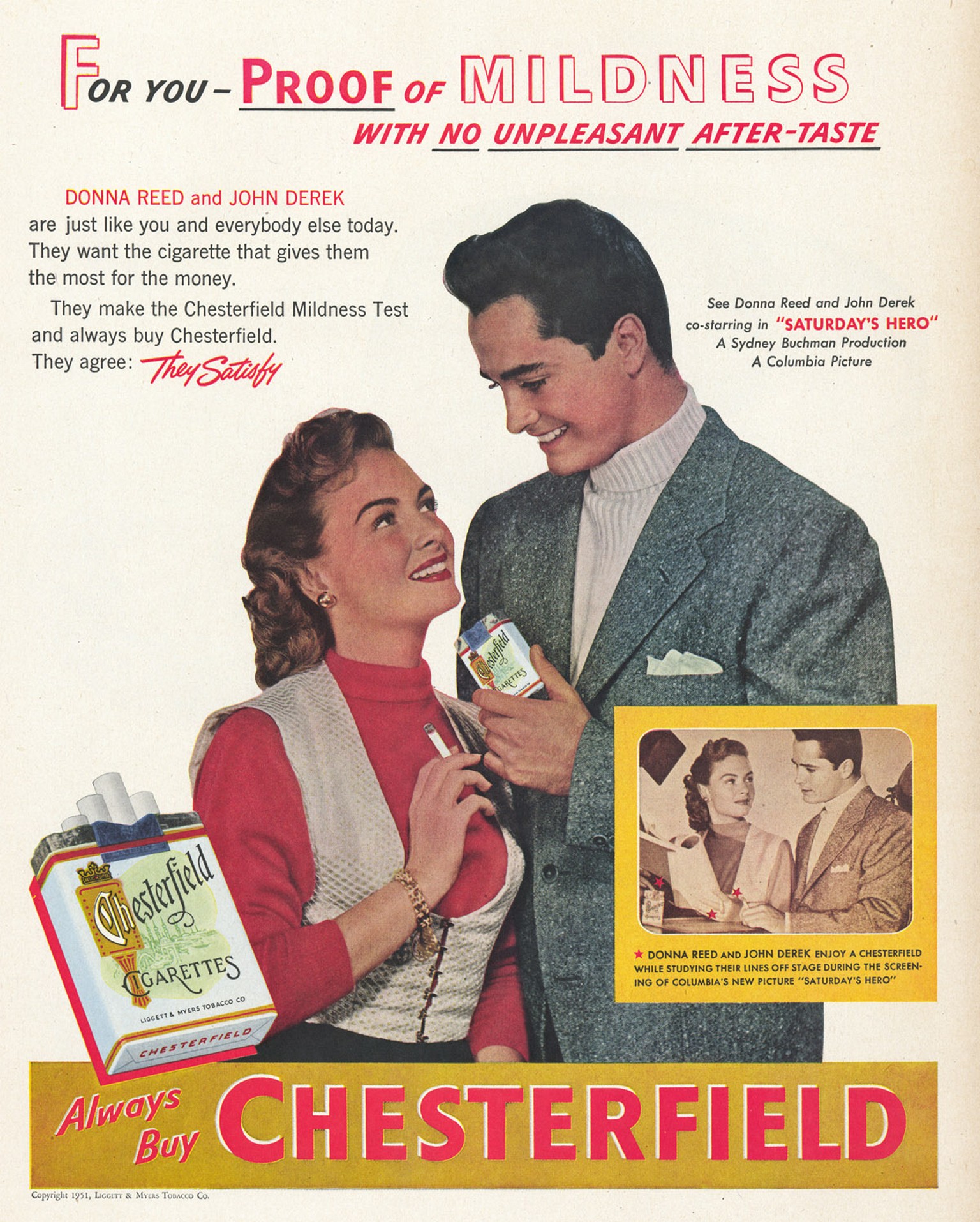 1951 For You – Proof Of Mildness With No Unpleasant After-Taste. Donna Reed and John Derek. Always Buy Chesterfield