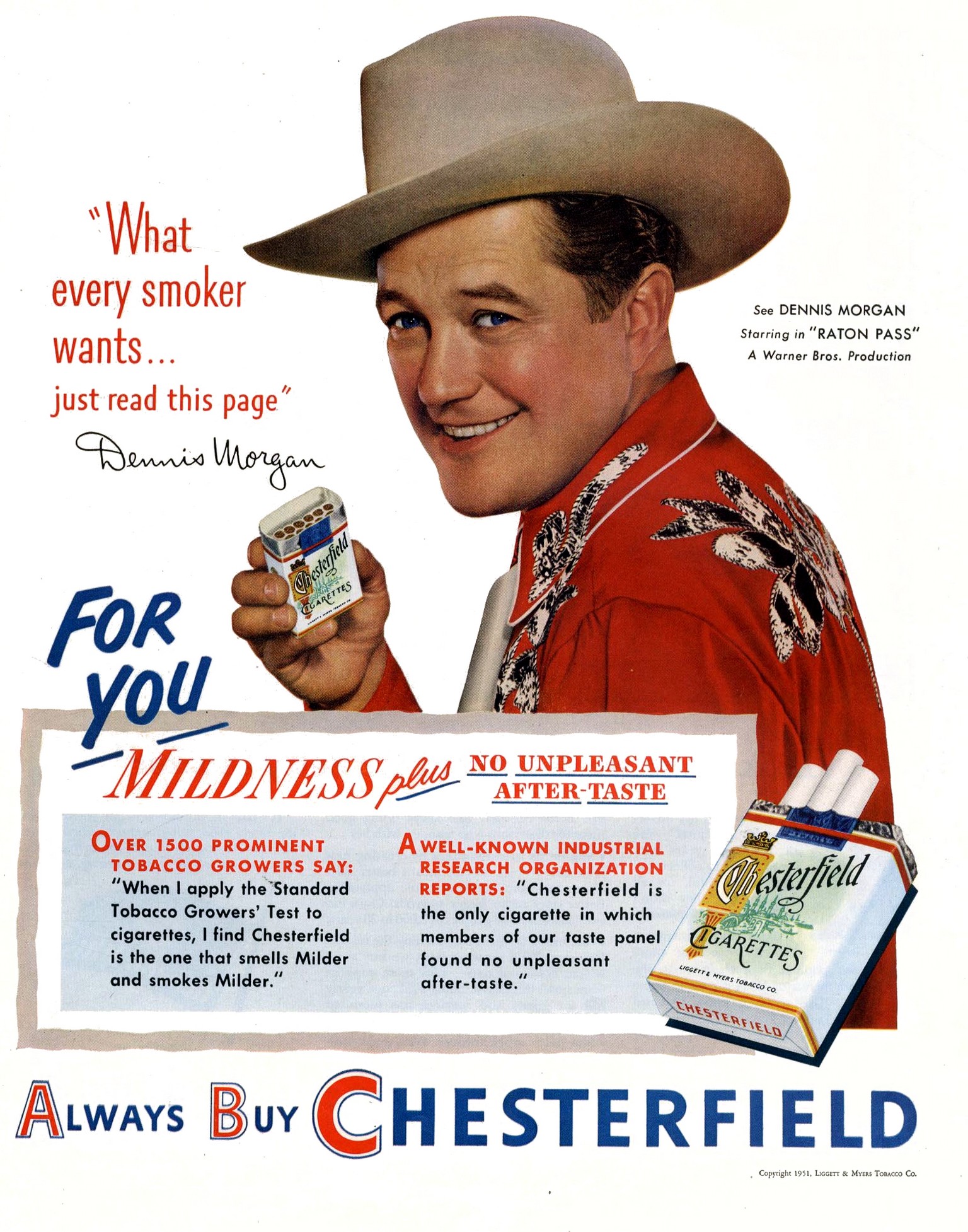 1951 ‘What every smoker wants… just read this page’ Dennis Morgan. Chesterfield
