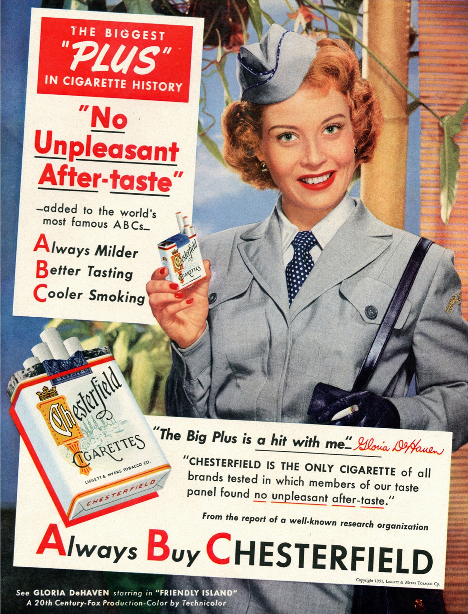 1952 Gloria DeHaven with Chesterfield. ‘No Unpleasant After-taste’ Source: Stanford School of Medicine