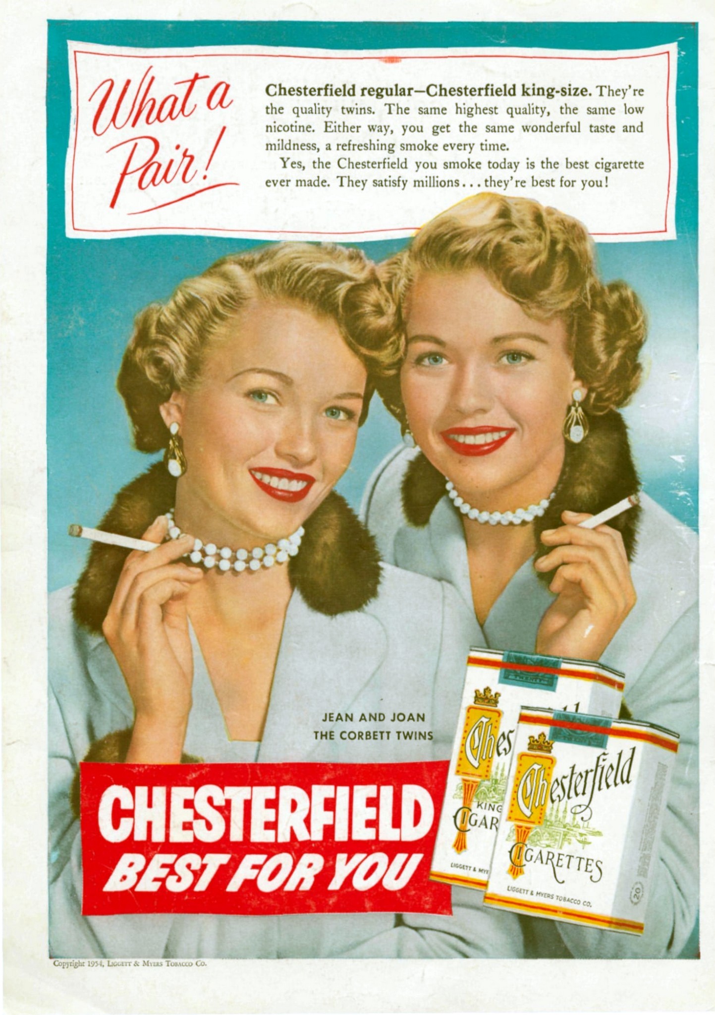 1954 What a Pair! Jean and Joan the Corbett Twins. Chesterfield Best For You Source: Sports Illustrated Magazine