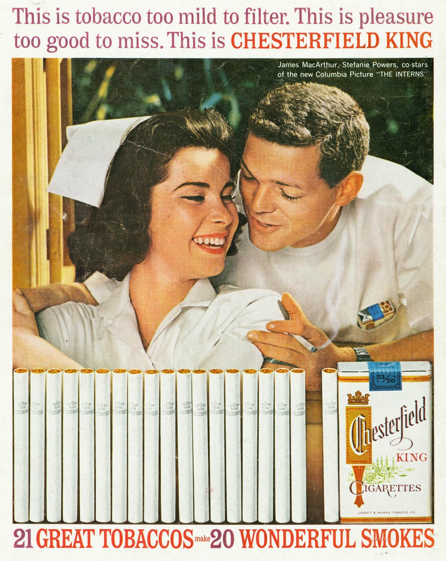 1962 This is tobacco too mild to filter. This is pleasure too good to miss. This is Chesterfield King