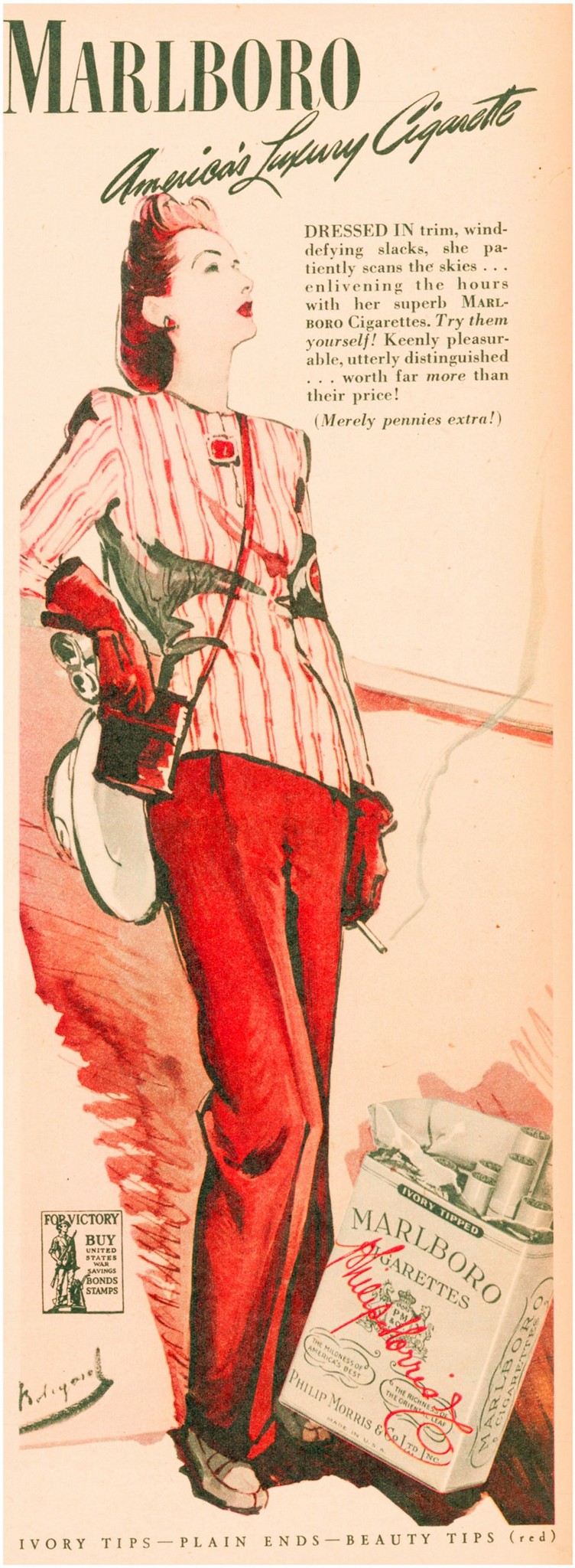 1943 Marlboro America’s Luxury Cigarette. Dressed In trim, wind-defying slacks Source: Stanford School of Medicine