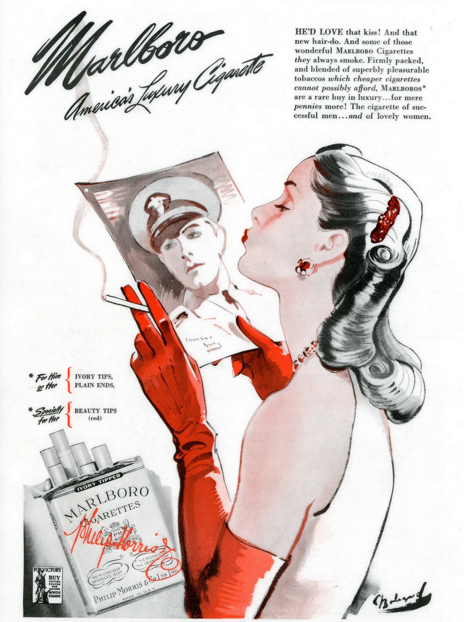 Main » Smoking » Marlboro Ad and Poster Collection » 1944 Marlboro America’s Luxury Cigarette. He’d Love that kiss!