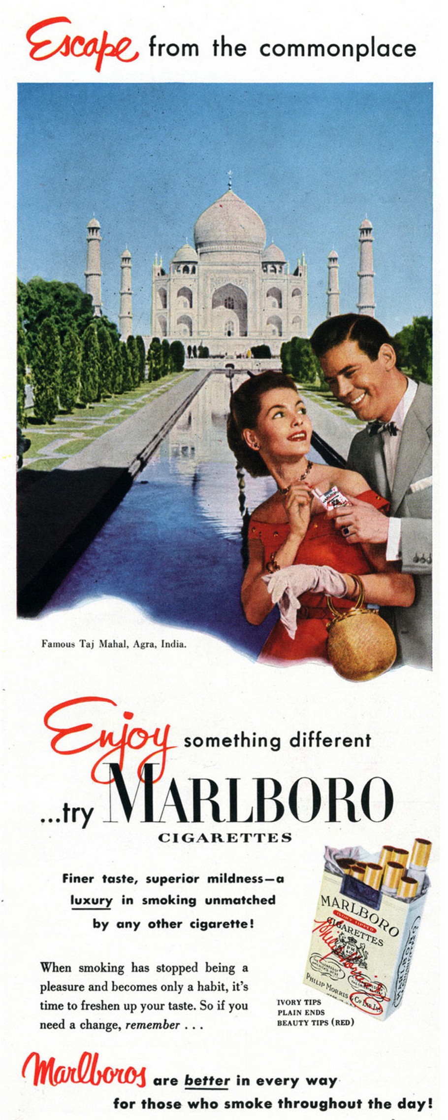 Main » Smoking » Marlboro Ad and Poster Collection » 1952 Escape from the commonplace. Famous Taj Mahal, Agra, India. Enjoy something different … try Marlboro