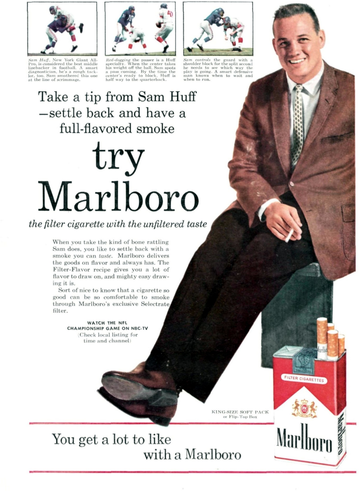 Main » Smoking » Marlboro Ad and Poster Collection » 1960 Take a tip from Sam Huff. – settle back and have a full-flavored smoke, try Marlboro