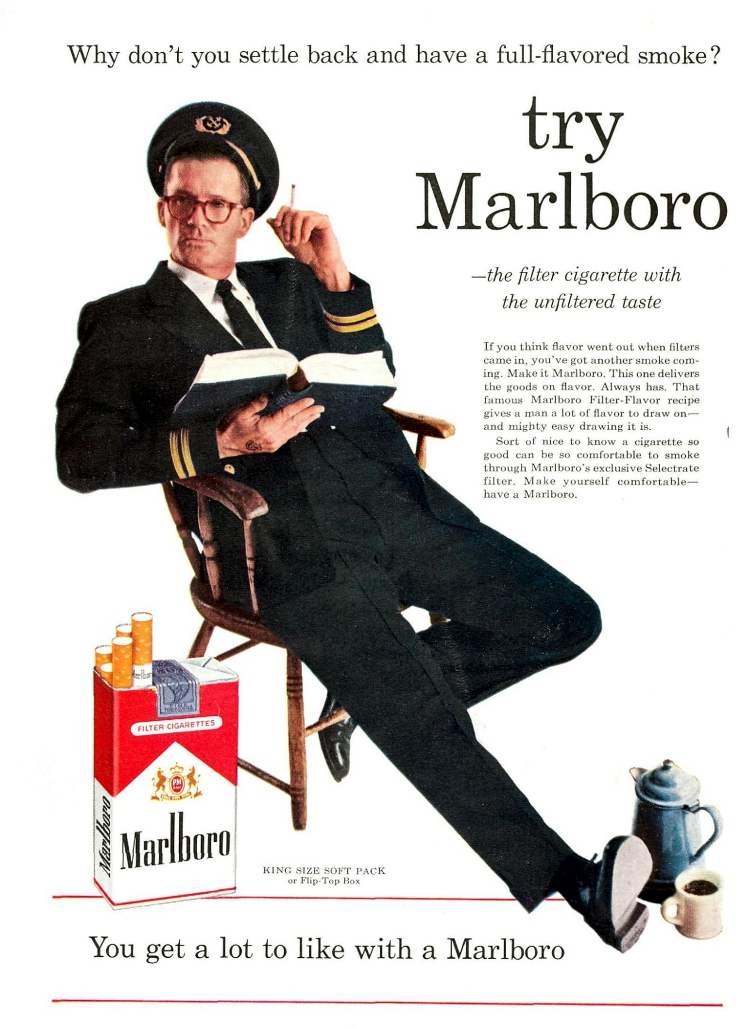 1960 Why don’t you settle back and have a full-flavored smoke. try Marlboro (1) Source: Sports Illustrated Magazine