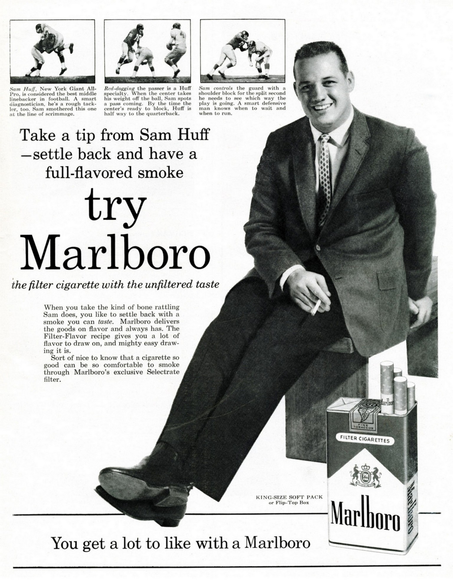 1964 Take a tip from Sam Huff – settle back and have a full-flavored smoke, try Marlboro