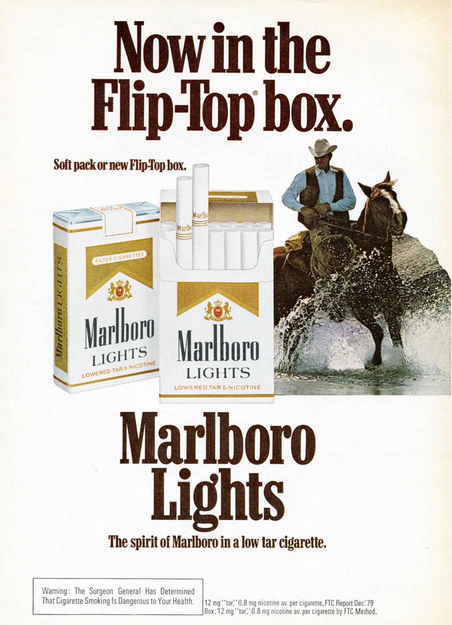 Main » Smoking » Marlboro Ad and Poster Collection » 1980 Now in the Flip-Top Box. Marlboro Lights. The spirit of Marlboro in a low tar cigarette