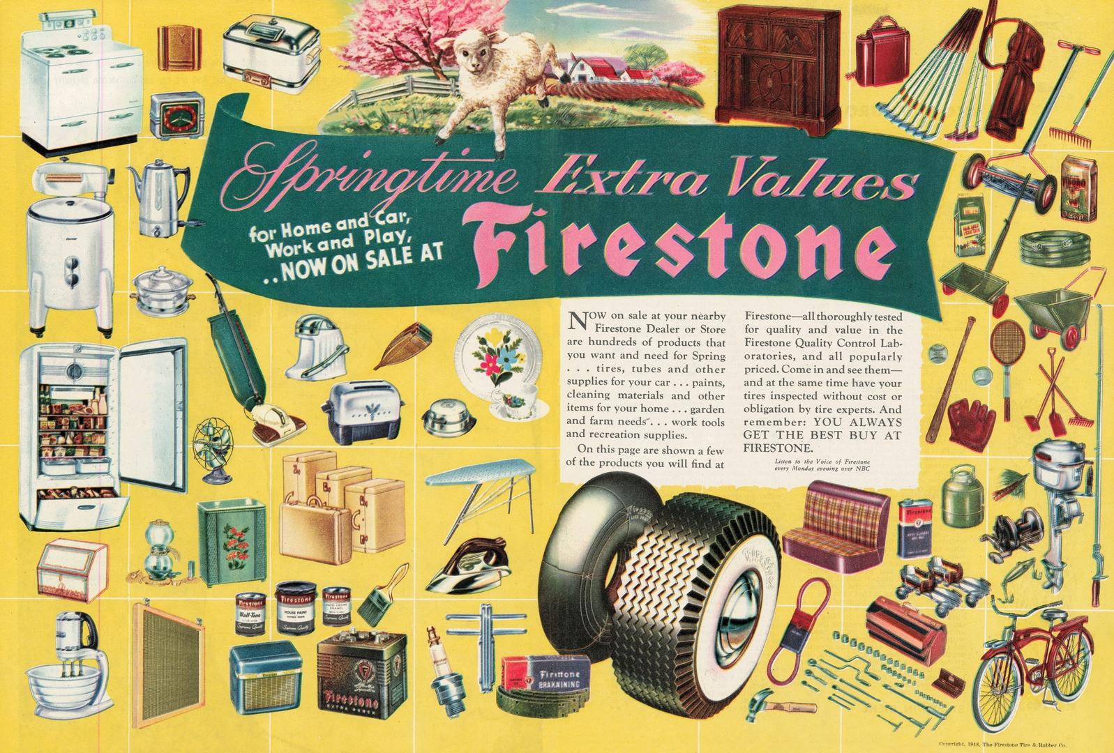 1948 Springtime Extra Values for Home and Car, Work and Play, … Now On Sale At Firestone