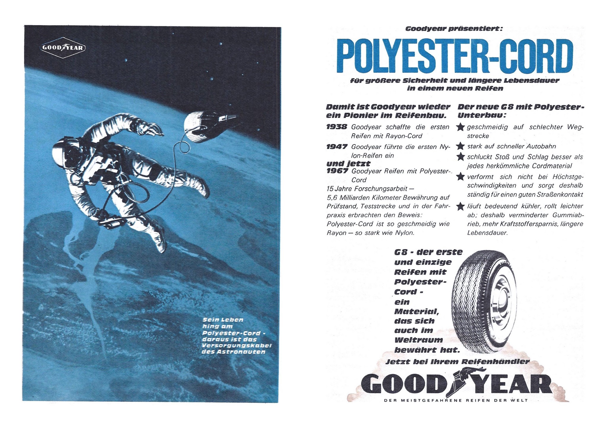 1967 Goodyear präsentiert Polyester-Cord für größere Sicherheit und l’ngere Lebesdauer in einem neuen Reifen